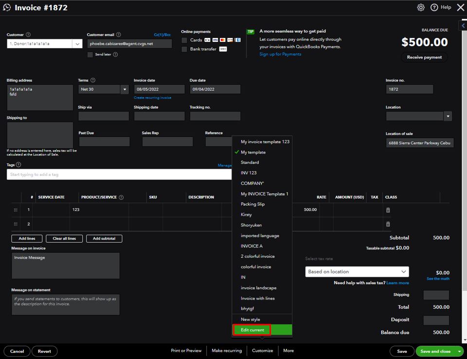 For now, we can perform some basic troubleshooting to determine the cause of the unusual behavior. When you click Print or Preview on an invoice, check the template's footer text.