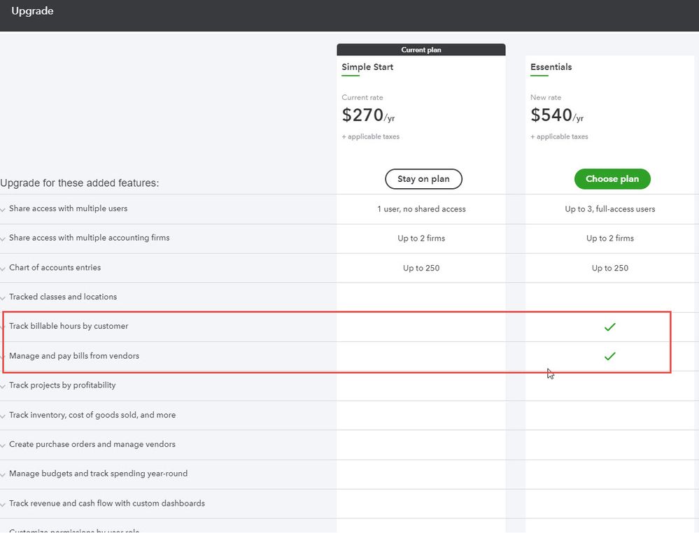 I did recently drop from Essentials to Simple Start. We are a small, 2 person shop. The only differences noted in the matrix were 'Track Billable Hours by Customer' and 'Manage and Pay Bills from Vendors'. Neither option was necessary for our business. Having a PO# on the Invoice IS, however, critical to our business and I would venture to say critical to most businesses. I sincerely hope we don't have to pay an extra $270/year just to get PO# printed on our invoice??!!