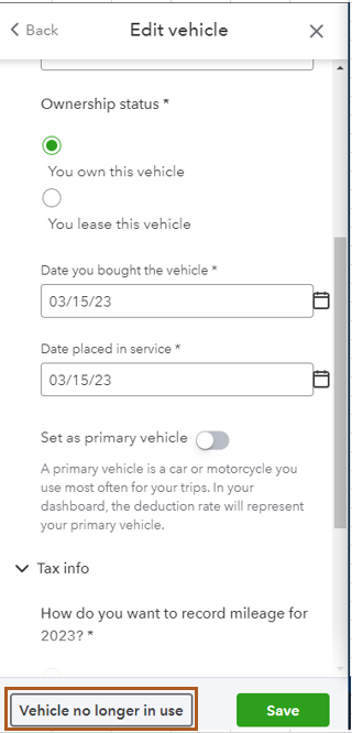You will see the Vehicle no longer in use option if you did not set up the vehicle as the primary one. If you want to remove it from the list, you can use the vehicle first as the primary. Then, open the vehicle again and you will see the option at the bottom part. See the sample screenshot below: