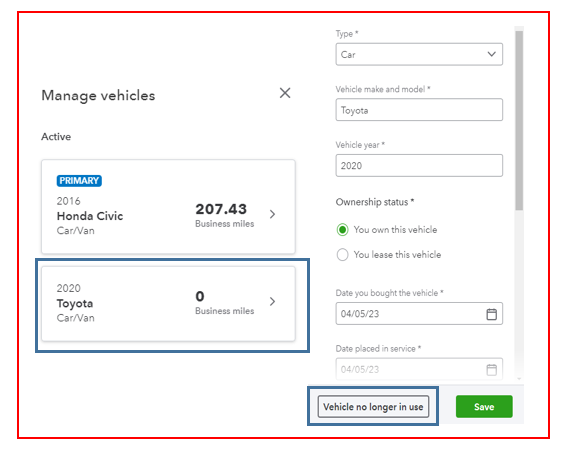 The option to select the Vehicle no longer in use will only show if it's a non-primary vehicle.