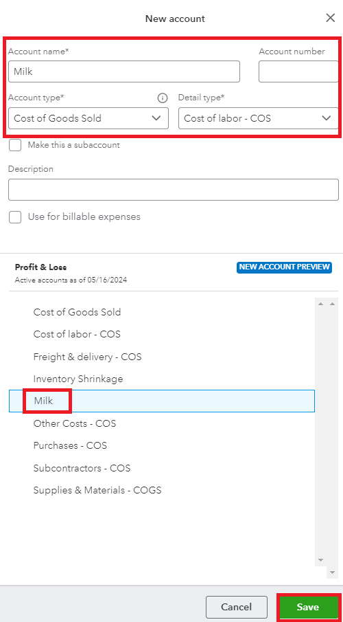 - Name the account Milk or provide a relevant name that describes the expense.