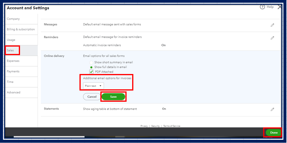 Let's modify your settings to Plain text to exclude the due date from the summary invoices. Unfortunately, this adjustment didn't affect online payments. I'll guide you on how to do it.
