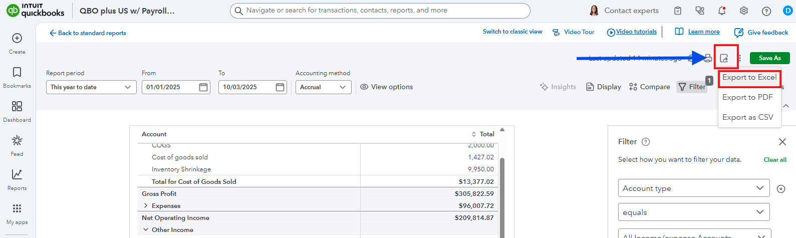 You can locate this option in your Statement of Activity report by going to the upper right corner, clicking the Export icon, and selecting the Export to Excel option.