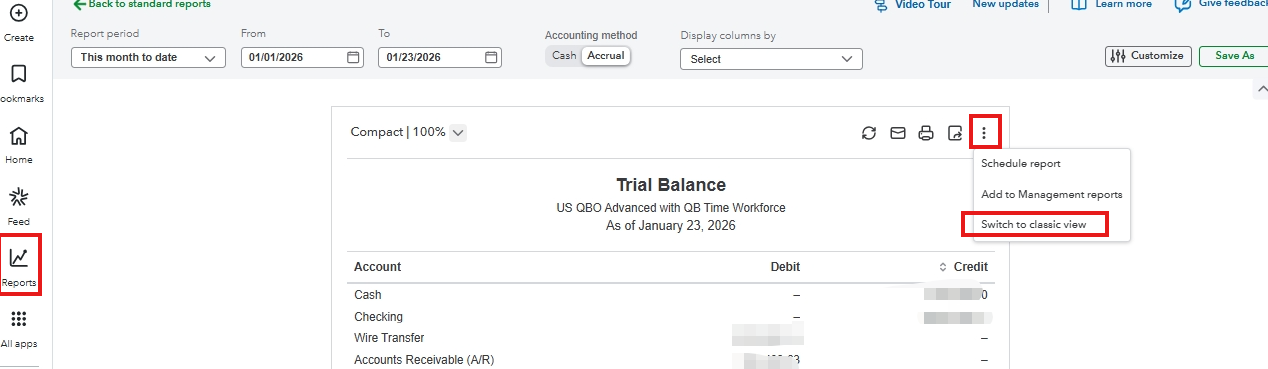 Switching back to the classic view in QuickBooks Online depends on the type of report you’re using. Below is a list that allows switching to the classic view, along with instructions on how to do it: