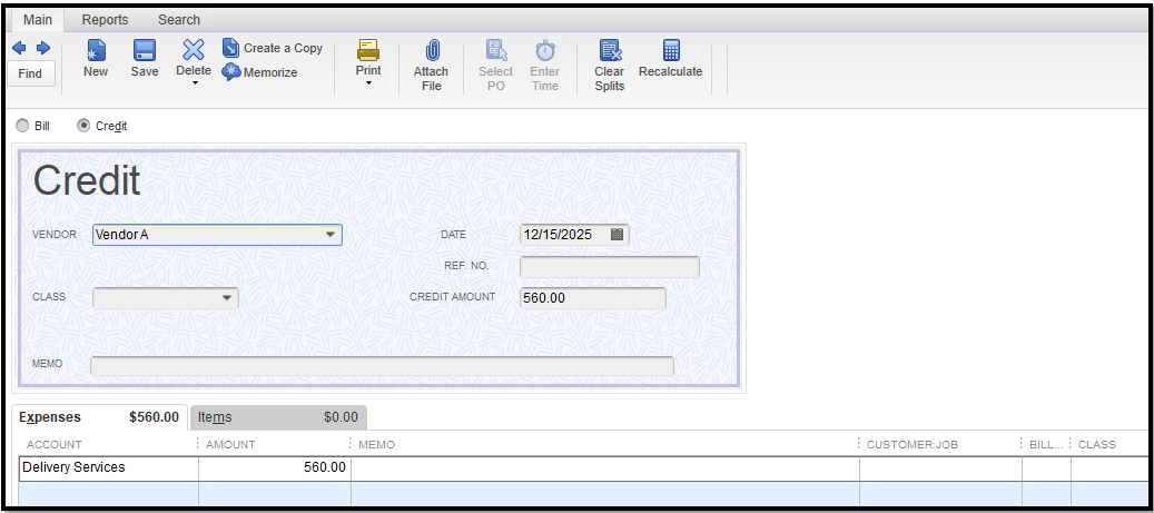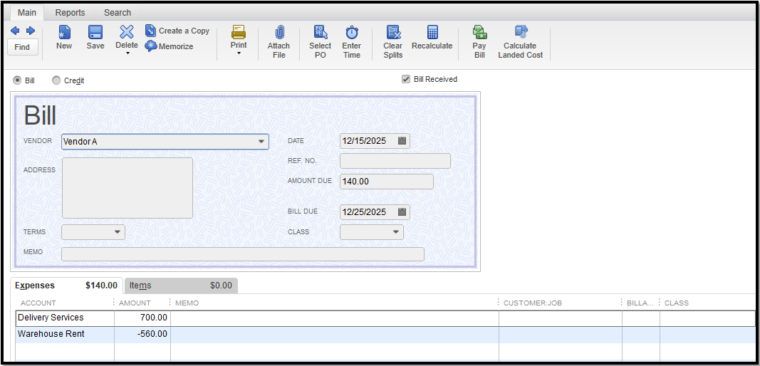Let's start by entering a bill affecting the delivery services expense account and adding a negative line item for the amount you need to transfer to Vendor B.