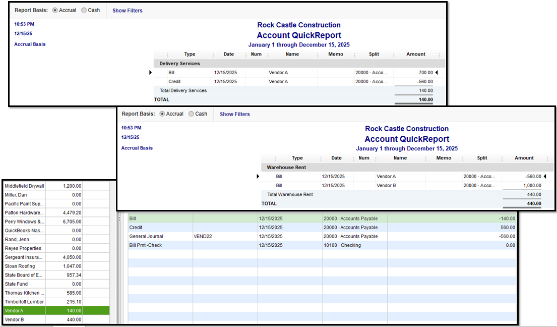 After that, generate a vendor credit ($560) for Vendor A to transfer to Vendor B.