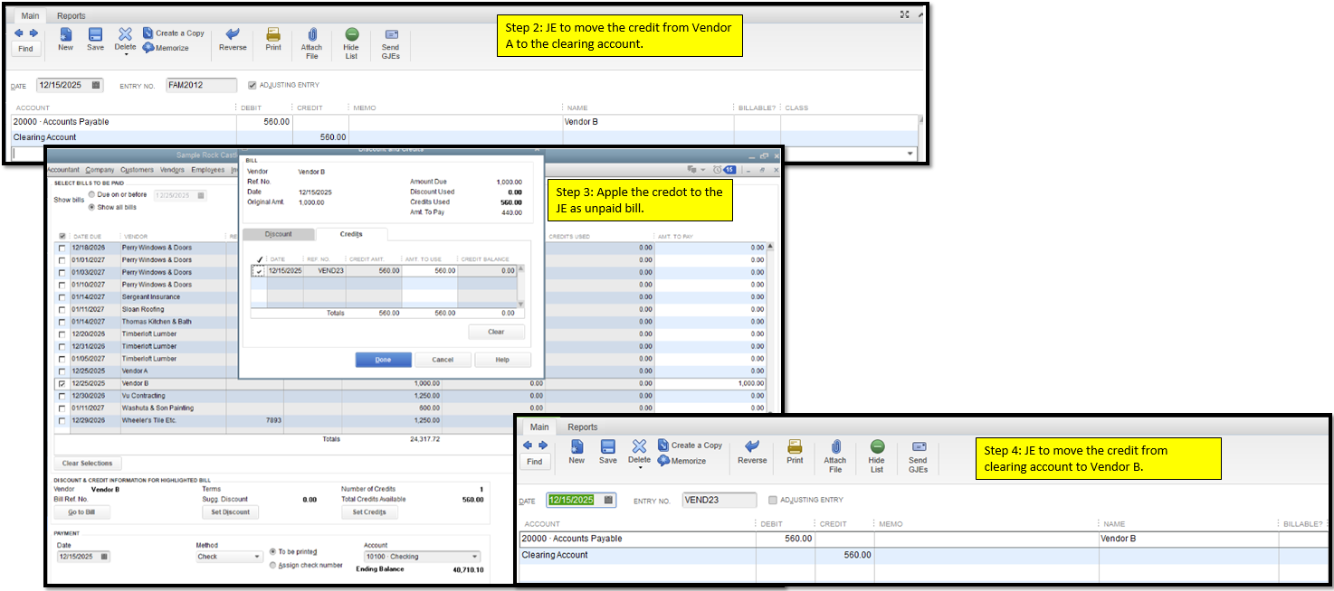 Once done, you can now transfer the credit from Vendor A to Vendor B using journal entries. Here is an article for the detailed process: Transfer and apply credit from one vendor to another in QuickBooks Desktop.