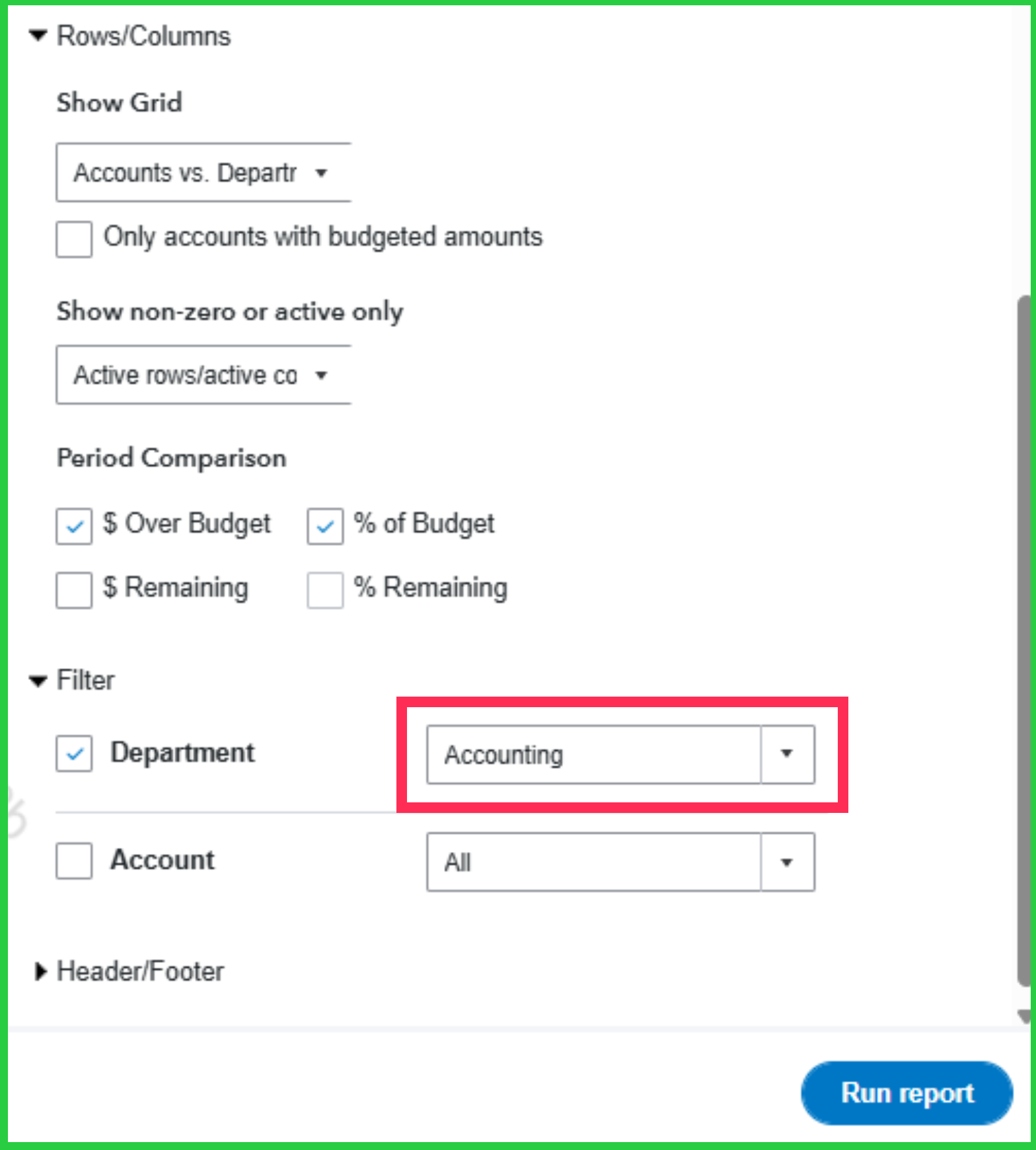 Since all departments appear together in the budget reports, you can use the Filter feature for Department to view the report for each department separately.