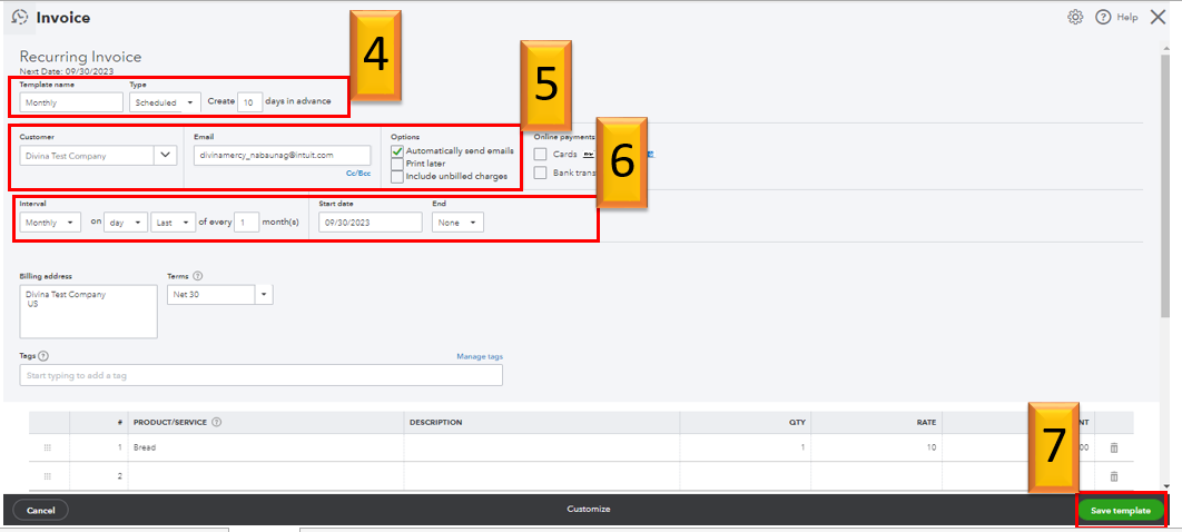 After saving it, the invoice will automatically be created monthly, depending on the details you enter.