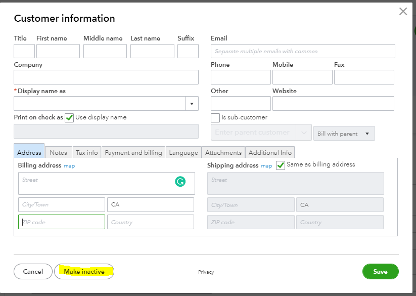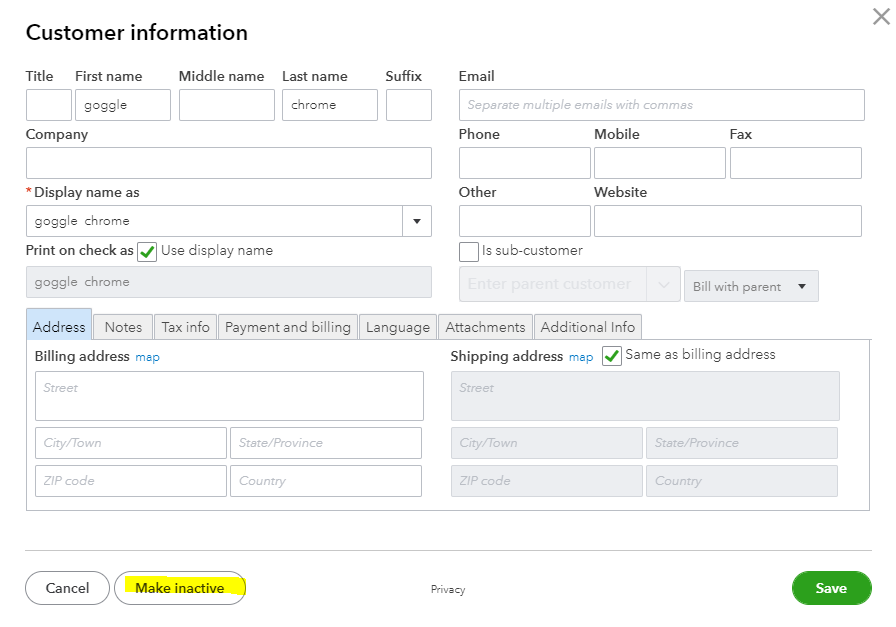 4. To remove the customer's name, select Make Inactive.