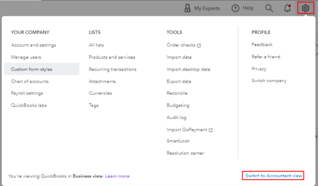 Before doing so, let's switch to accountant view so you'll be able to see the Sales menu in QuickBooks Online. Changing this view won't affect your company data.