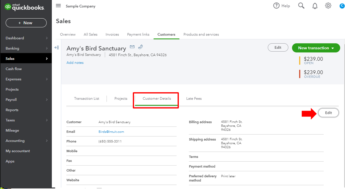 3. Go to the Customer Details tab, click Edit.
