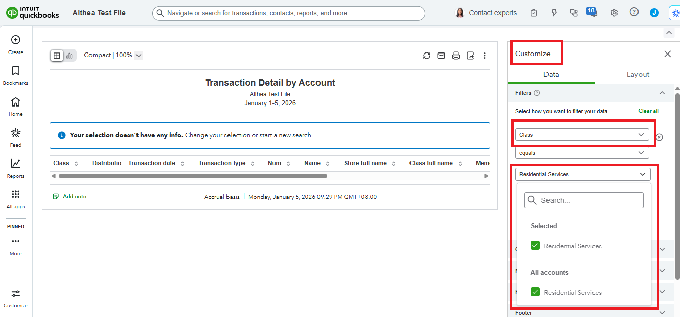 Buy nowI created a report using Transaction Detail by Account but I need a Transaction Detail by Class instead. Please Help!