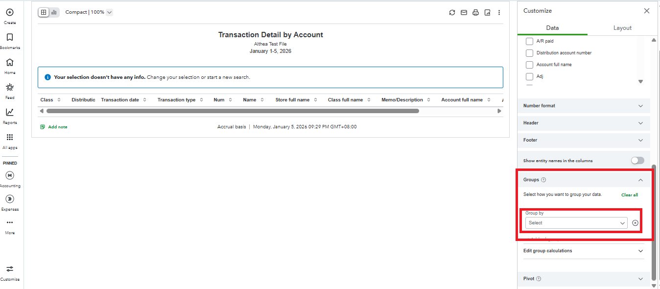 QuickBooks Online (QBO) does not offer the Transaction Detail by Class report by default, unlike QuickBooks Desktop (QBDT). However, you can customize the Transaction Detail by Account report in QBO to include class groupings and running balances for each Class. Here’s how: