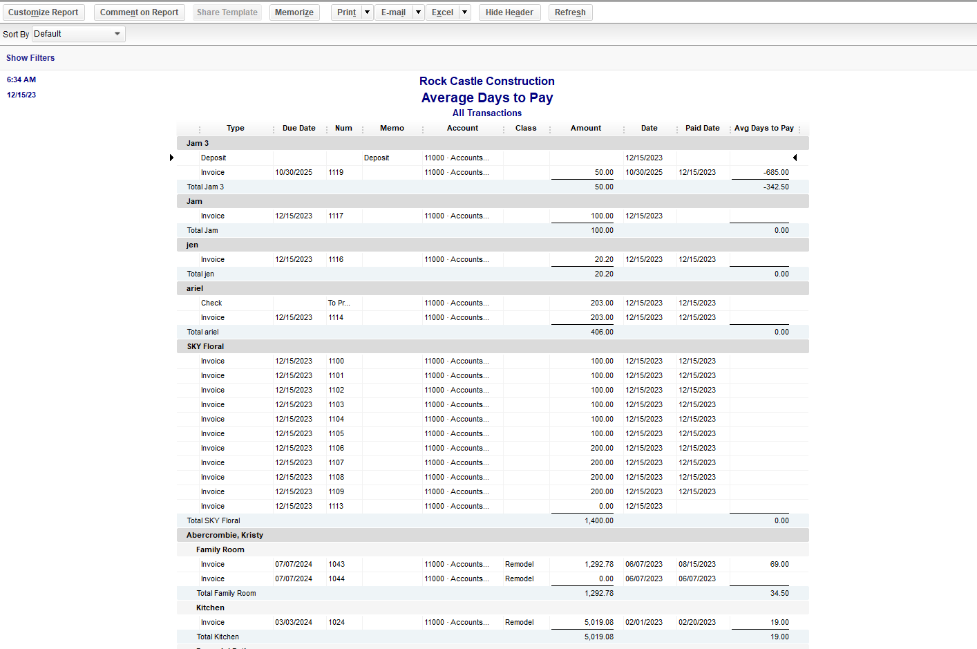 I have tried the Average days to pay and the Customer transaction report. I have not had success.