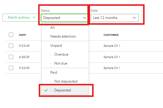 - Press the Status dropdown and select Deposited below the Paid option.