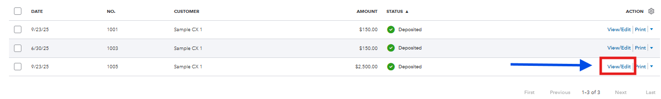 - Locate the invoice that was marked as deposited and has an incorrect amount. Then, click the View/Edit beneath the Action column.
