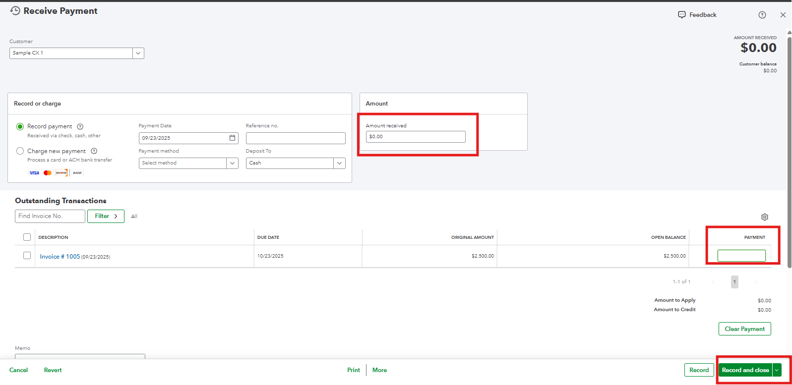 - Zero out the Amount received and Payment field to make sure that the amount of the settlement will be removed and also be corrected. After that, Record and close.