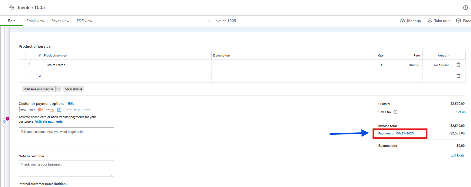 - Once you are in the transaction field, move your cursor to the payment link, under the Invoice Total section, and tap it.
