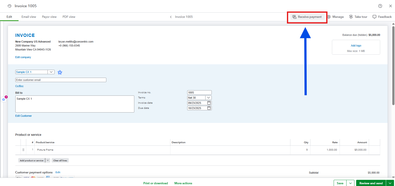 - Once done, hover your mouse to the Receive payment tab within that invoice transaction to balance the total based on the correct deposited amount in your original bank account. Then, follow the necessary process in receiving payment.