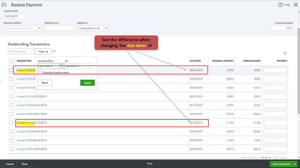 When receiving the payment of your invoices in QuickBooks Online (QBO), you have the option to filter the invoice you want to pay clicking the arrow beside Filter. If you wish to pay invoices on a certain date/period, you can filter the dates from there.