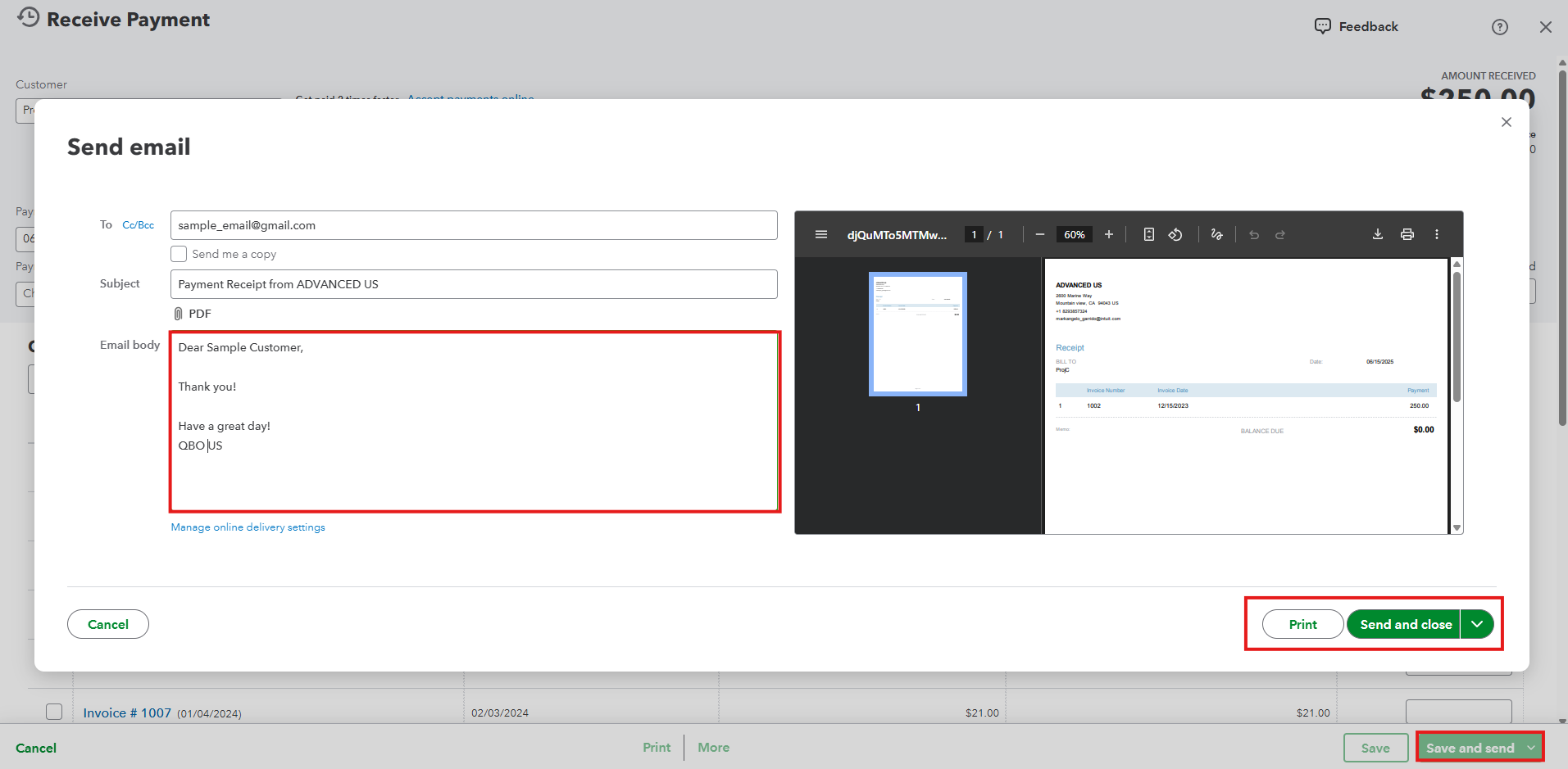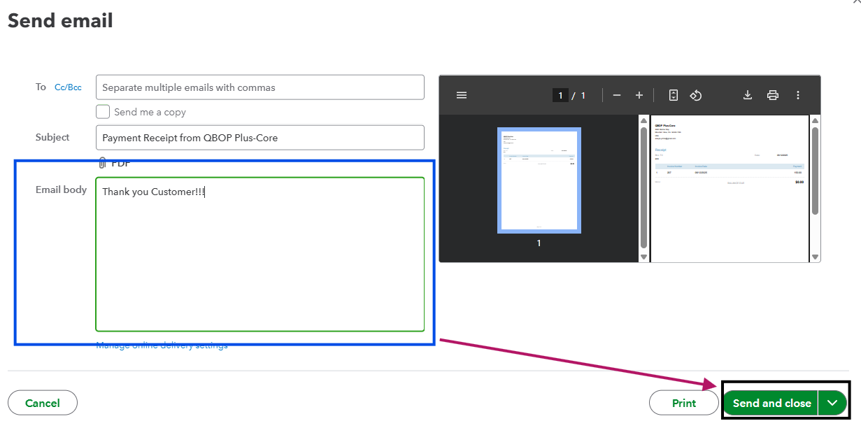 Once you're there, go to the Email Body to change the message to "Thank you," then click Send and Close to send this to your customer.