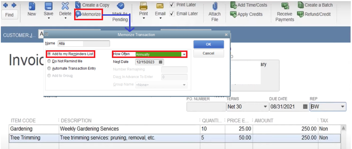 2. Open the Memorized Transaction from your reminders list.