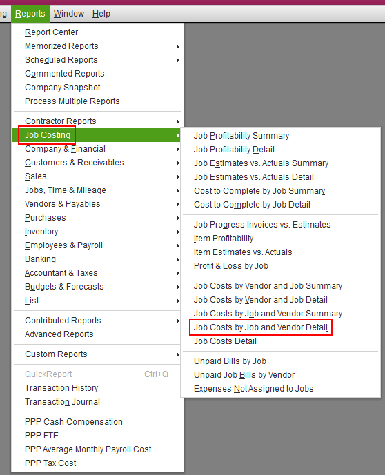 QuickBooks Premier Contractor Edition and Accountant Edition offer a wider range of job costing reports. You can find the reports you need by following these steps: