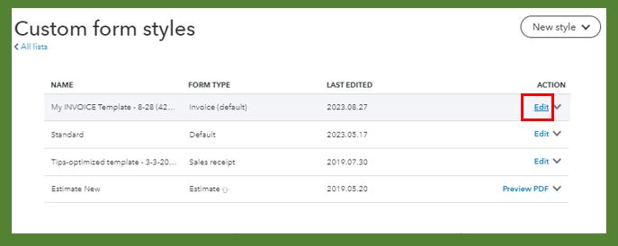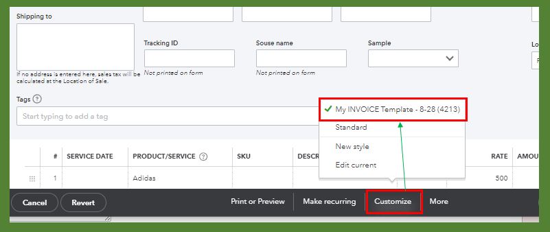 Before re-printing the invoices, make sure to use the template that you modified earlier. To verify, click Customize on the invoice transaction. From there, choose the template. Then, click anywhere on the page to close out the pop-up box.