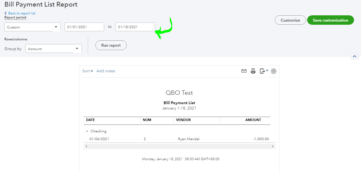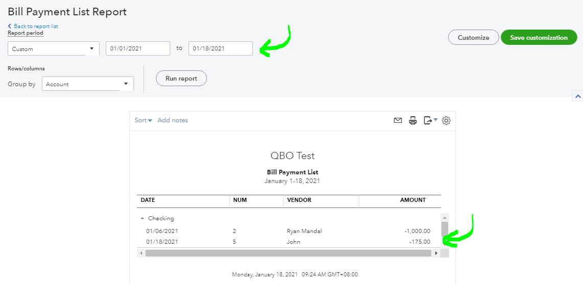 Make sure that you've linked the checks to the correct vendor bill. This way, it will show up on the Bill Payment report. Also, ensure that you've adjusted the Report period of the statement on when the payment was made.