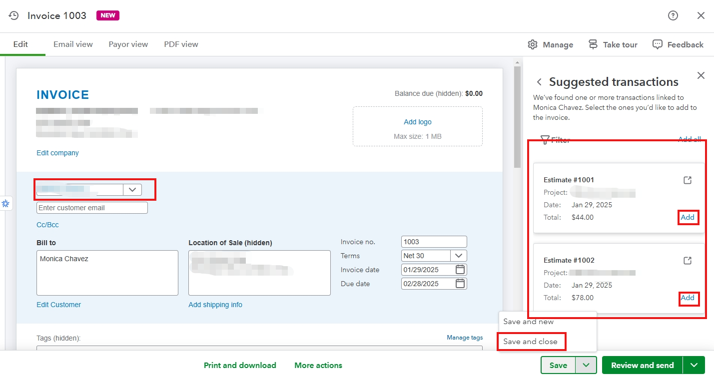 After that, if you have already turned it on, you can now proceed to create a new invoice and link the transactions. It will just automatically show up if you selected one of your client. Please make sure you to select Save and Close after.