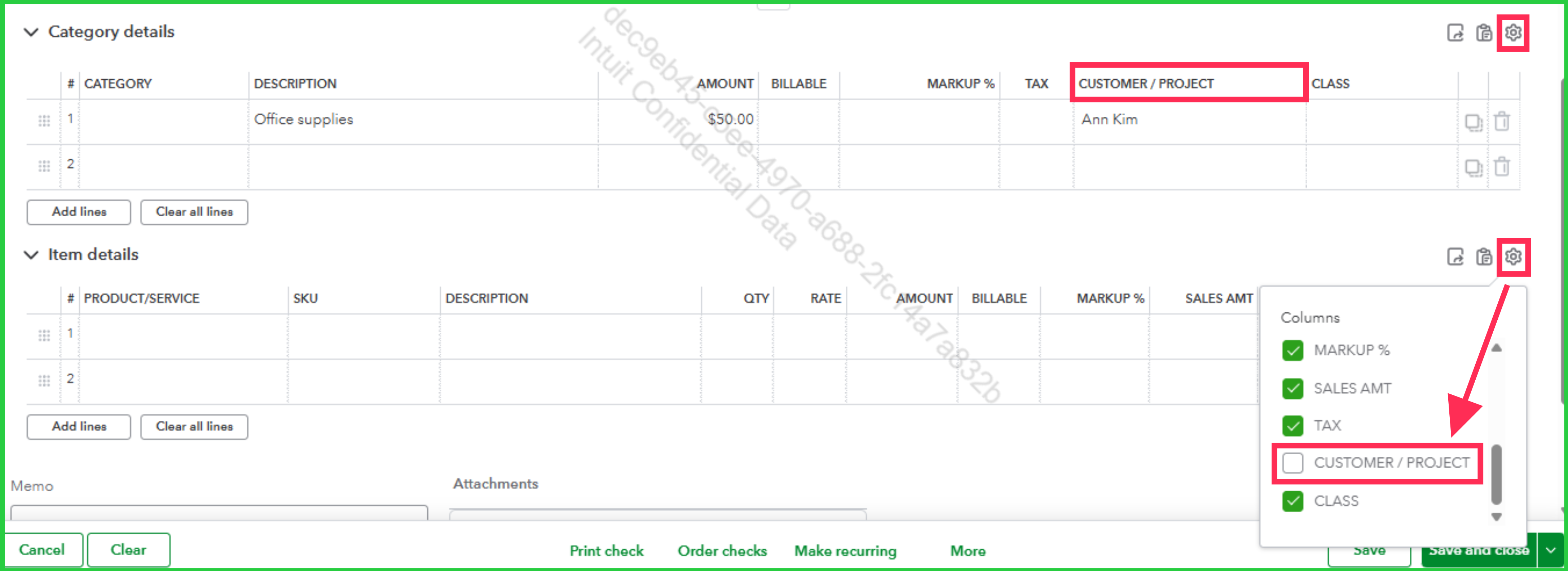 - Within the expense transaction, click the Gear icon for either the Category or Item details.