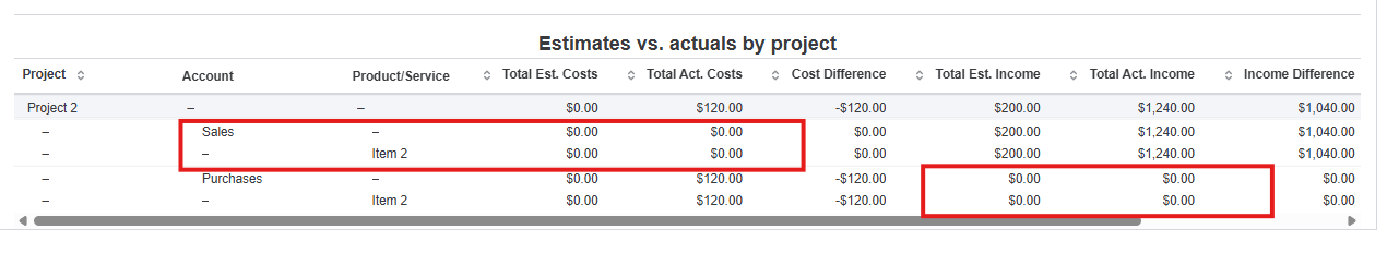 If you are reviewing the Estimates vs. Actuals by Project report, the data is shown based on the affected accounts (such as income and expenses). Here’s how the information is displayed: