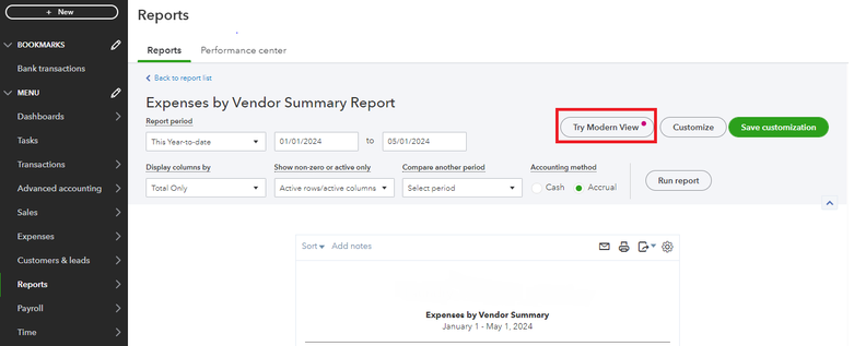 However, if you mean rearranging your columns from your Expense report, this is available to the Modern View experience. If you're currently on the Classic view, I recommend switching to the new one by selecting the Try Modern View button.