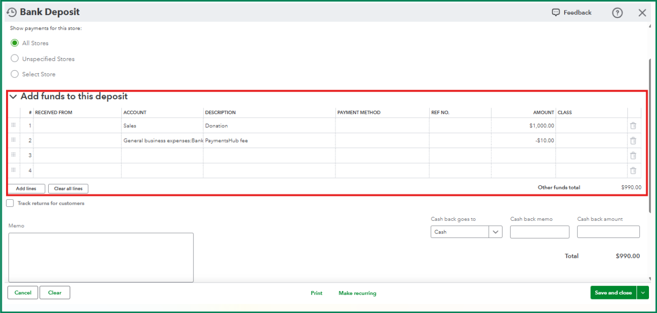 Regarding your transactions: From what I understand, your Bank transactions page shows the downloaded donation amount as less than the payment hub fee. For example, let's say the donation is worth $1,000, but only $990 is deposited into the bank because there's a $10 fee for the payment hub. Here's a different approach that you can use to reflect this in your books.