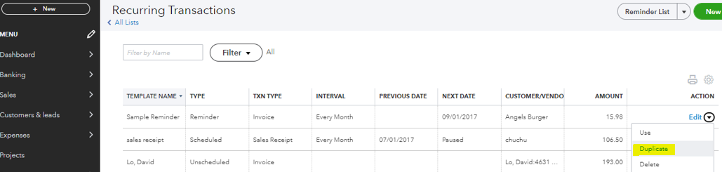 We can start creating a recurring invoice by going to the Gear icon and pick Recurring transactions under the Lists column. To record a recurring invoice, you can open it. The steps below will guide you through the process.