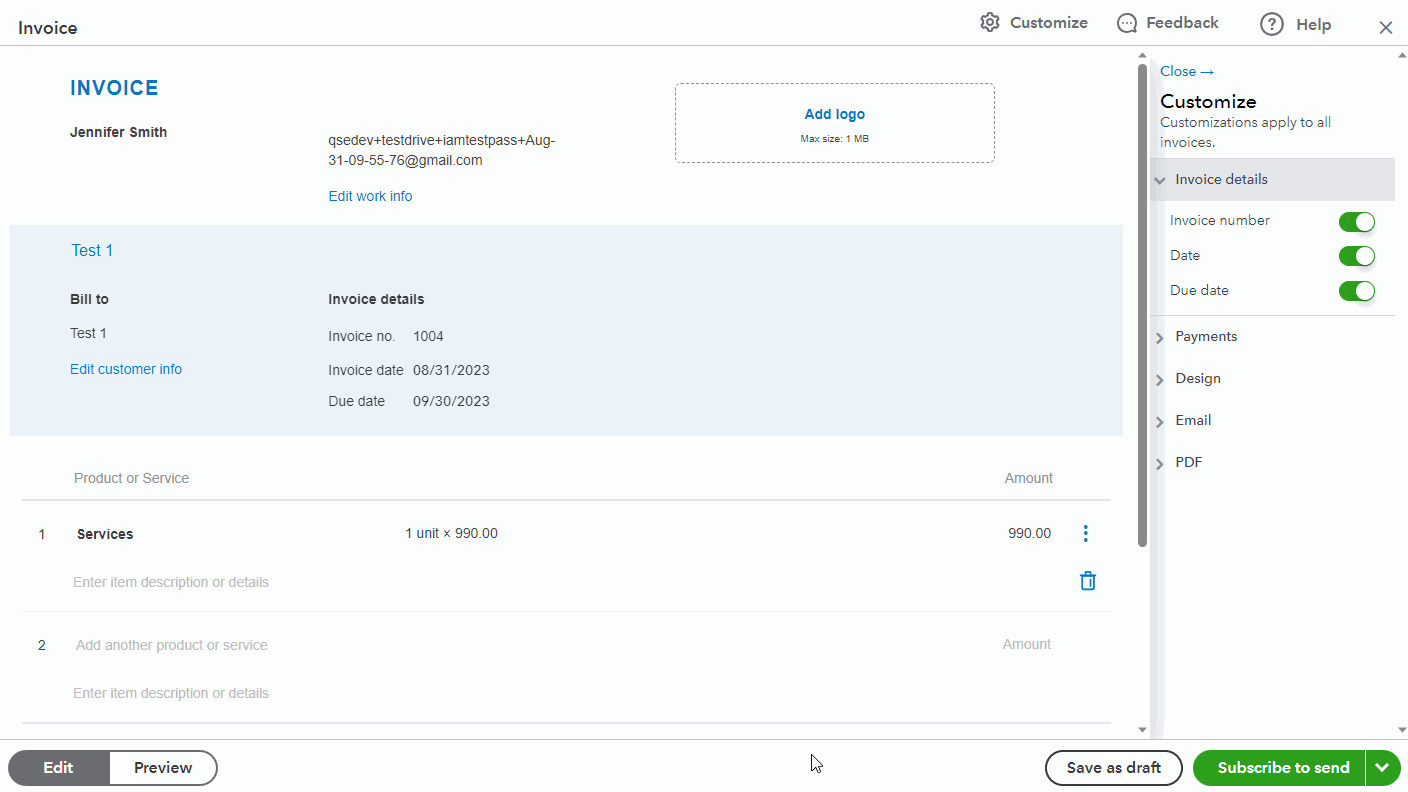 If you want to view/save a draft invoice as a PDF, or print a copy of it, you can use its Print option while not editing your draft. A new tab will open and display a PDF copy of the draft invoice and won't create your official invoice. This keeps the invoice in a Draft status.