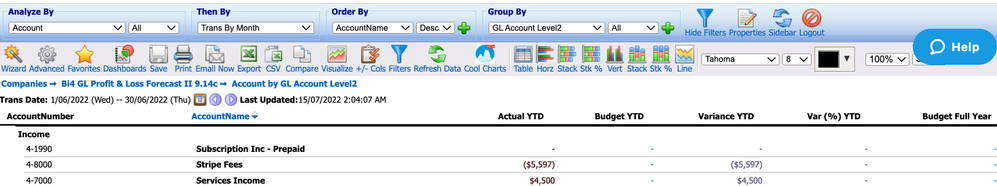 As an example our solution BI4Cloud Business Intelligence comes with a standard P&L format that will let you easily report Actual YTD v Budget YTD v Full Year Budget.