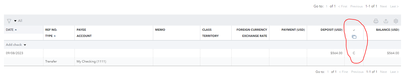 - Select the account and hit View Register. You should see a column like the one below indicating if it was cleared.