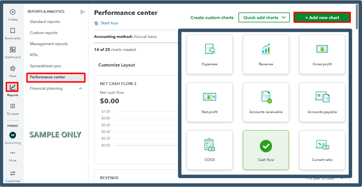 If you're using QuickBooks Online Advanced, you can use the Performance Center feature to showcase revenue, net income, and cash assets. However, census information isn't directly tracked within the platform.