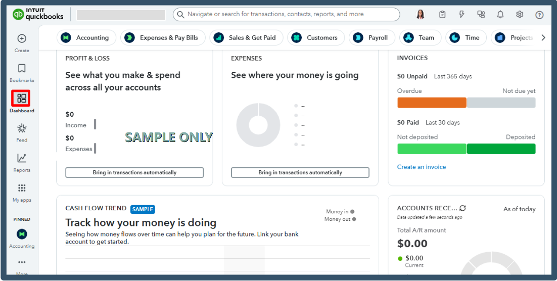 In QuickBooks Online, there's a feature that provides a clear overview of your finances, which is the Dashboard menu. It summarizes your income and expenses, provides a chart for profit and loss, and displays your bank account balances. However, some of the metrics you mentioned do not appear on this tab.