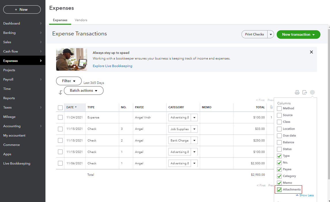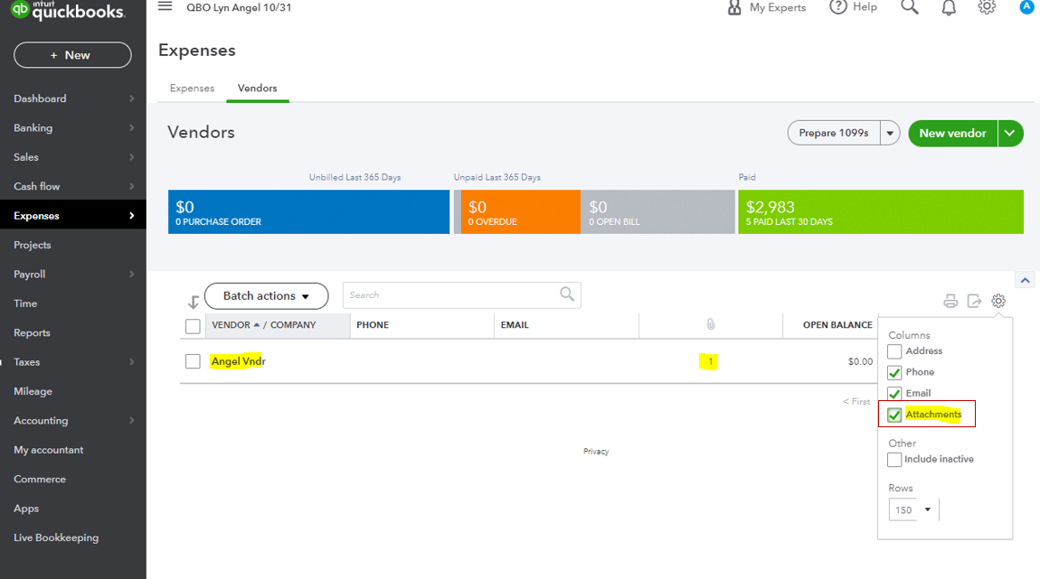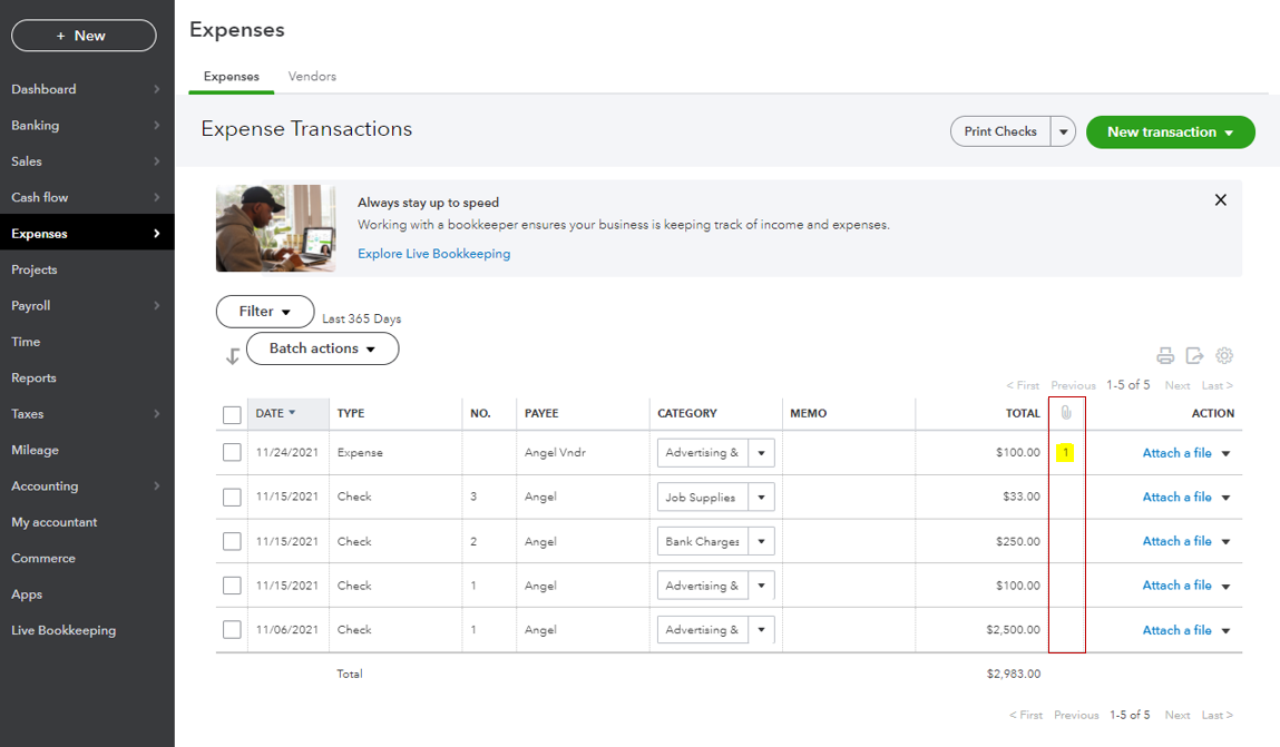 Yes, there's an indication of attachments that are linked to your transactions or vendor names. You can identify it without opening your transaction or the vendor profile through the Attachments column. I'll guide you on how.