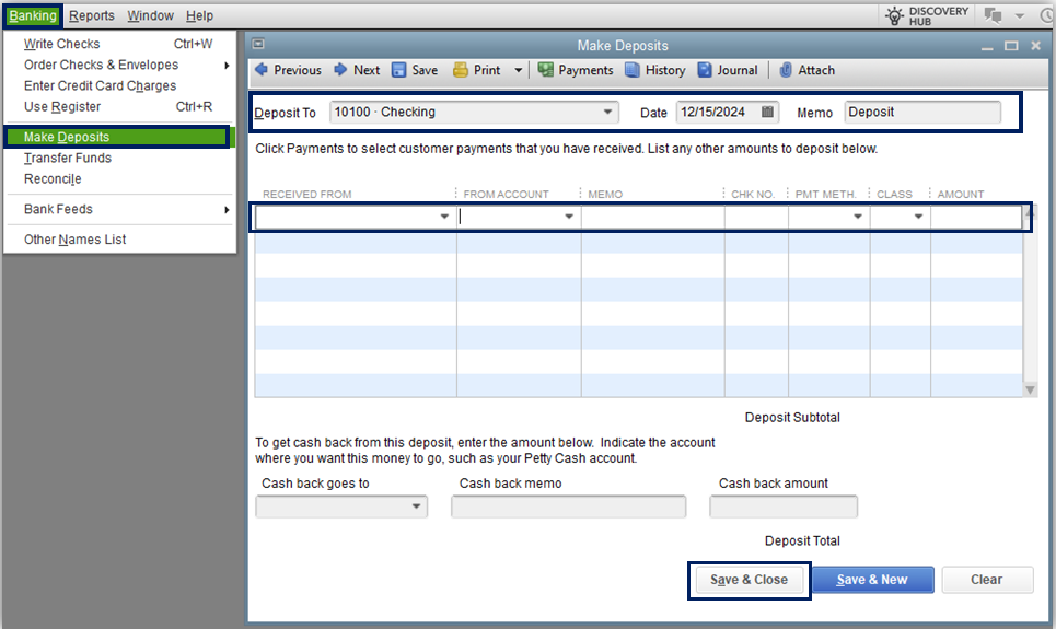 For a more detailed step-by-step procedure for this process: Record and make bank deposits in QuickBooks Desktop.