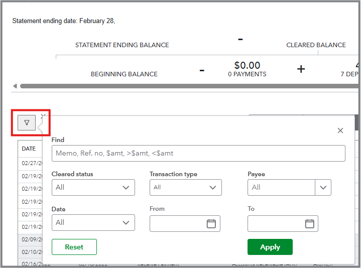 To ensure all February 2025 transactions display accurately in the reconciliation screen, please double-check that the Statement ending date matches the period on your bank statement. Otherwise, you can click the Funnel icon in the Reconciliation page to filter February transactions.