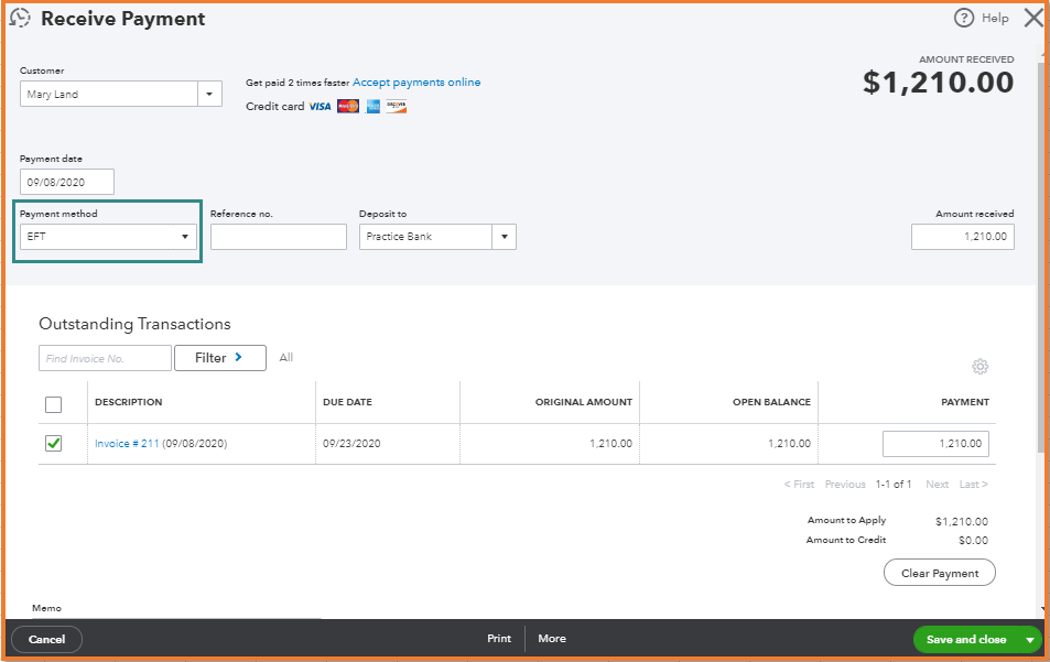 5. Make sure the payment is equal to the open balance, then click Save and close.