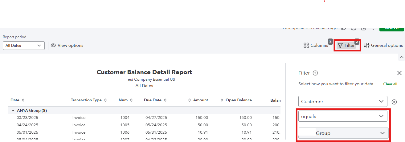 Follow the steps below to use the filter of a report to show only the transactions for one customer: