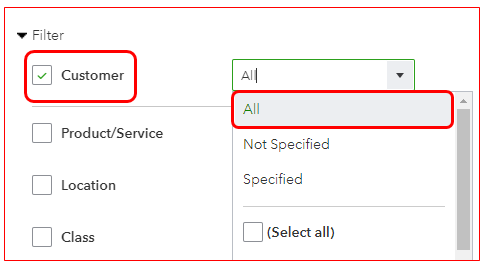 The list of customers in the Sales by Client Summary report may have been filtered, which could explain why a client isn't appearing for the same period as in the Revenue by Client Summary report. To check, let's open the report again and click Customize. Then, navigate to the Filter section. In the Customer drop-down list, ensure that All is selected.