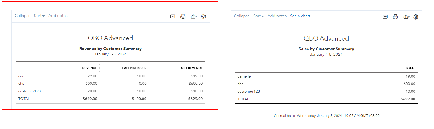 You are seeing different data because each report has its own unique set of information. The Revenue by Client Summary report gives us a picture of income, expense, and net income by customer.