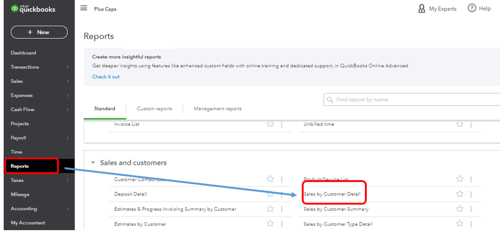 Sales by Rep report is only available in the QuickBooks Desktop version (QBDT). To find it in QuickBooks Online, you can use the custom fields and add Sales Rep in the column as a workaround. Then run the Sales by Customer Detail Report, and filter Sales by Rep. Since this is just a text field so you will need to assign a sales rep every time you create an invoice or sales receipt.