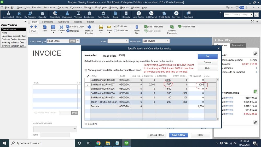 Kindly see first picture. I open sales order from invoice. I am writing qty 1000 to invoice box. But I want to invoice qty 1500. I want qty 1000 in one line of invoice and qty 500 2nd line of invoice.